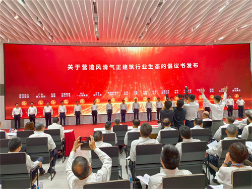 會議播放了建筑行業(yè)發(fā)展成果視頻《基石之力筑夢中國式現(xiàn)代化》;中國建筑董事長、黨組書記鄭學選進行了主旨發(fā)言;倡議發(fā)起單位代表中鐵二局黨委副書記、總經(jīng)理張兵,中核集團副總工程師、中國核建黨委書記、董事長陳寶珠,上海建工集團黨委副書記、工會主席殷紅霞,濰坊昌大建設集團董事長徐鵬強分別進行了表態(tài)發(fā)言;中建一局黨委書記、董事長左強代表建筑企業(yè)宣讀了倡議書,中建二局、中國核建、中機建設、中國中冶、通用技術集團新興公司、中國化學國際公司、中鐵電氣化局、中鐵建設、中交一公局集團、中國電建水電七局、中國能建浙江火電、中國安能一局、北京城建、隧道股份、廣東建工控股、山東科達集團、濰坊昌大建設集團、興泰建設集團領導,共同按壓大屏手印圖案,聯(lián)合發(fā)布了《關于號召建筑行業(yè)黨組織和廣大黨員在營造風清氣正行業(yè)環(huán)境中走在前作表率的倡議書》。
