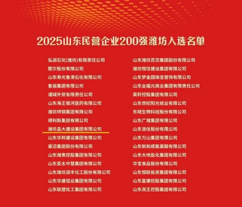 會(huì)上,昌大建設(shè)集團(tuán)憑借穩(wěn)健的發(fā)展、突出的行業(yè)貢獻(xiàn)及良好的社會(huì)口碑,不僅入選2025濰坊市50強(qiáng)企業(yè)名單,還連續(xù)榮獲2025山東民營企業(yè)200強(qiáng)等多項(xiàng)省級(jí)榮譽(yù)。同時(shí)集團(tuán)所屬泰和置業(yè)有限公司還獲得2025山東民營企業(yè)服務(wù)業(yè)100強(qiáng)等省級(jí)榮譽(yù),充分彰顯了集團(tuán)作為濰坊建筑業(yè)領(lǐng)軍企業(yè)的實(shí)力、地位和作用。